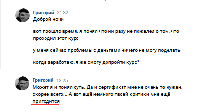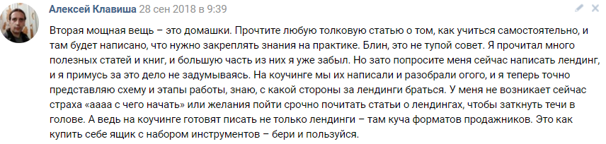 Мотивация же тренера на курсе — вполне понятна, ему за это платят. При этом ты уверен в экспертности этой обратки.