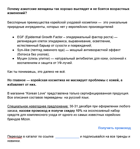 Новые продукты, запуски, сезонные эксперименты. Постоянные рассылки, новые рекламные компании, обновление старых текстов.