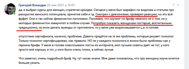 Мотивация же тренера на курсе — вполне понятна, ему за это платят. При этом ты уверен в экспертности этой обратки.